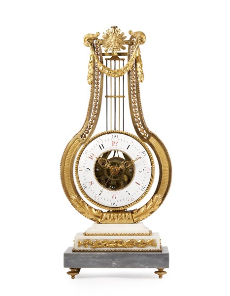 Orologio a lira con cassa in marmi e bronzi dorati. Quadrante a fascia a cifre arabe con secondi al centro. Movimento a due treni con scappamento a caviglie e suoneria delle ore e mezze su campanello. Francia, ultimo quarto del secolo XVIII (cm 18x44x11) (lievi difetti)
