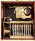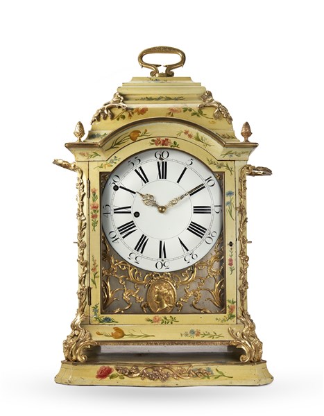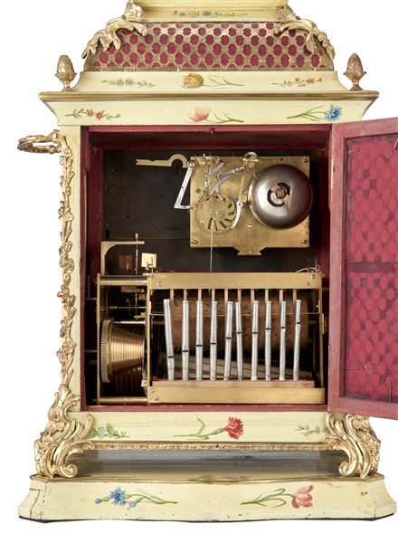 Lacquered wood and ormolu musical clock. White enamel dial with Roman numerals for the hours and Arabic numerals for the minutes. Two-train movement with hours and quarters chime on bells. In the lower part of the case is a cylinder organ with ten pipes and eight melodies. Switzerland, second half of the 18th century (cm 47x78x34) (defects and restorations)