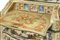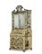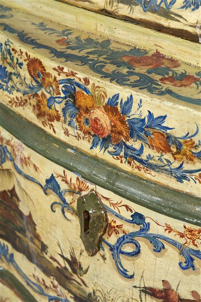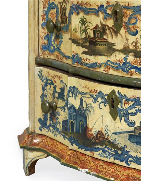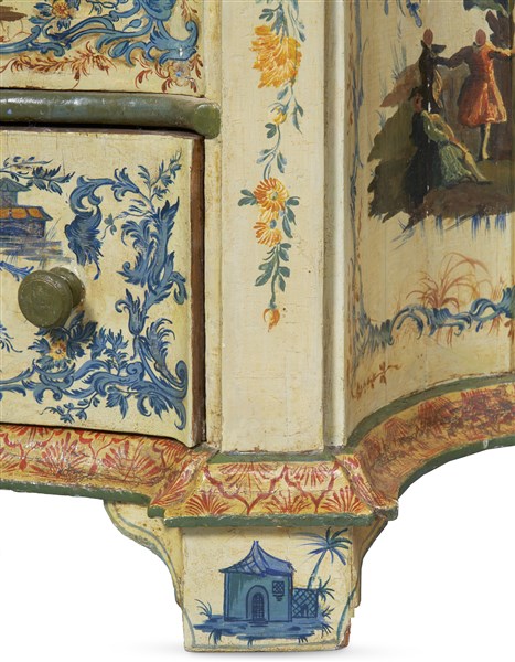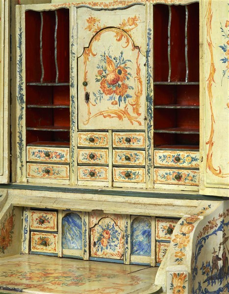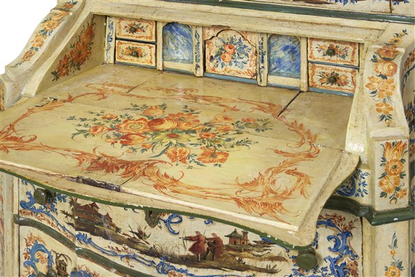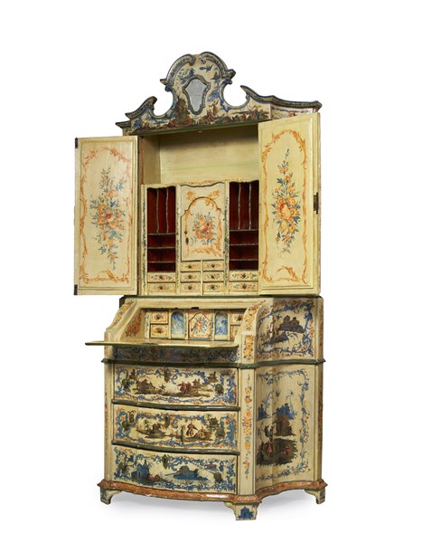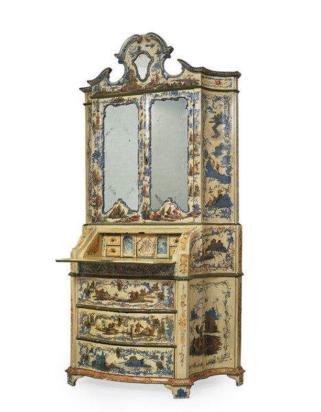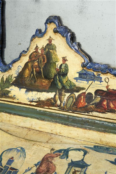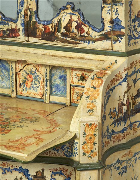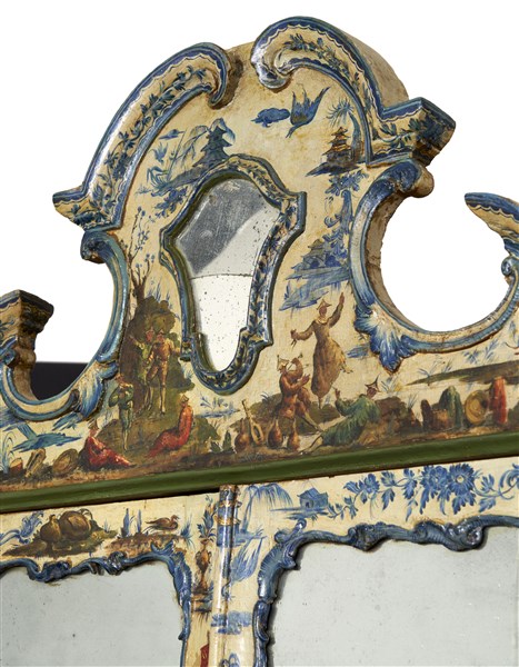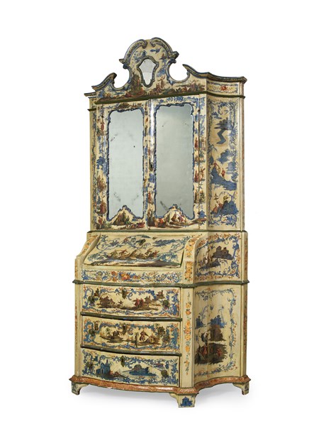 Trumeau in legno intagliato, dipinto e laccato a chinoiserie, scene di festa, venatorie e floreali in policromia entro riserve rocaille in blu e arancio. Fronte mosso e fianchi convessi. Parte inferiore a tre cassetti e calatoia celante quattro tiretti, piccola anta e vano scorrevole. Parte superiore a due ante con specchi che rivelano dieci tiretti, anta sagomata e diversi scomparti. Cimasa a volute contrapposte centrata da specchio sagomato. Veneto, secolo XVIII (cm 130x238x62) (difetti)