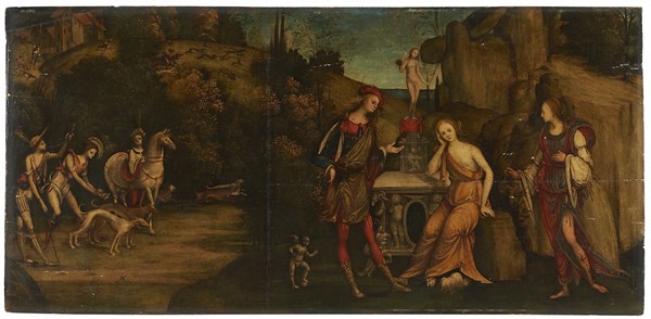 Amico Aspertini #"Scena allegorica"olio su tavola (cm 57x120)in cornice antica