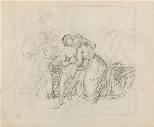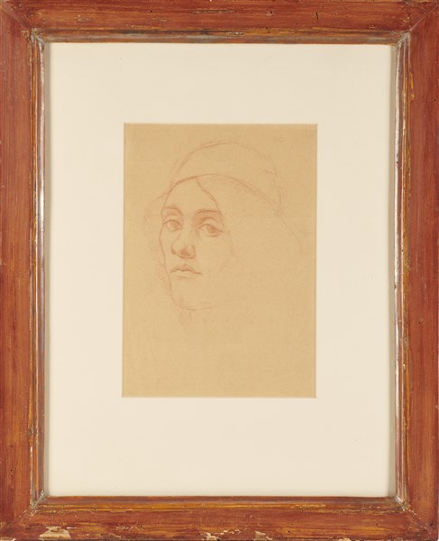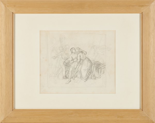 Lot comprising: - a drawing by Giuseppe Bezzuoli representing Paolo e Francesca at the front and a study of figures at the back, with embossed stamps by Bezzuoli Parri heirs, 190x226 mm, framed, defects - a drawing representing a modern copy from a Reinassance portrait (by Pinturicchio), 255x180, framed, defects