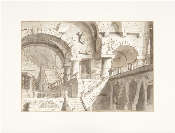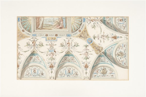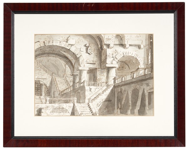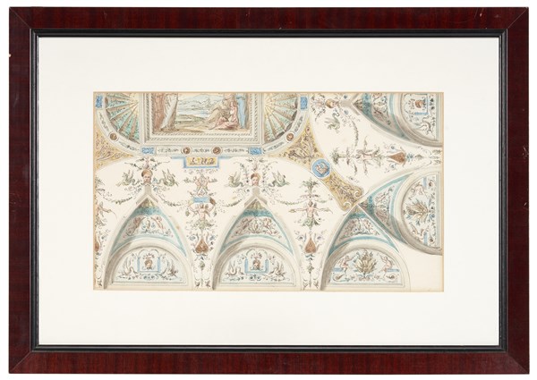 Lotto composto da uno studio di decorazione a penna, inchiostro bruno e acquerello e un disegno di scenografo del secolo XIX raffigurante uno studio di interno a penna e inchiostro acquerellato di grigio (mm 222x325; 195x355 al visibile), in cornici
