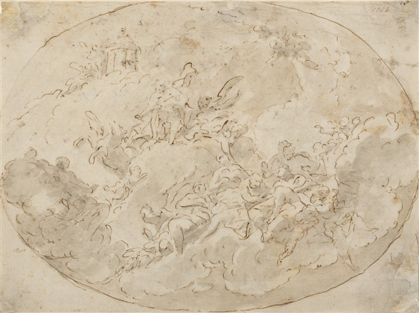-Scuola veneta del secolo XVIII,"Studio per soffitto", penna e acquerello (mm 196x265) in cornice in legno intagliato e dorato (difetti)