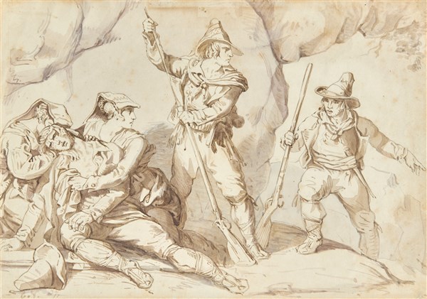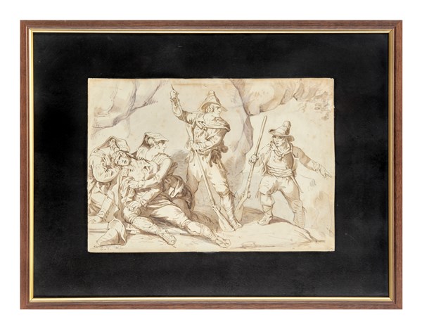 Bartolomeo Pinelli (attr.) "Brigante ferito" penna e acquerello bruno (mm 192x2