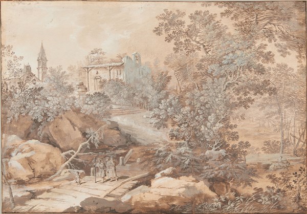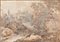 Bernardino Minnozzi (attr.) "Paesaggio con viandanti" tempera, acquerello e bia