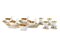 Manifattura di Dagoty, Parigi, inizio secolo XIX. Gruppo di cinque tazze in foggia di cigno con quattro piattini unite a quattro portaportauovo a forma di vaso con palmette retto da amorino in biscuit e porcellana decorata in oro (difetti)