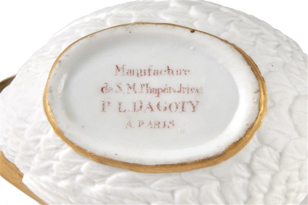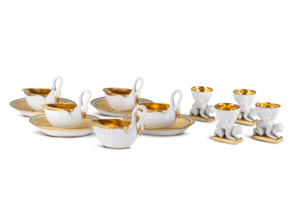 Manifattura di Dagoty, Parigi, inizio secolo XIX. Gruppo di cinque tazze in foggia di cigno con quattro piattini unite a quattro portaportauovo a forma di vaso con palmette retto da amorino in biscuit e porcellana decorata in oro (difetti)