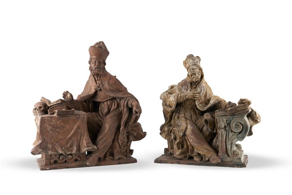 Scultore del secolo XVIII. Due figure di Vescovi in terracotta con tracce di policromia (cm max 41x42x23) (difetti e mancanze)