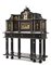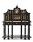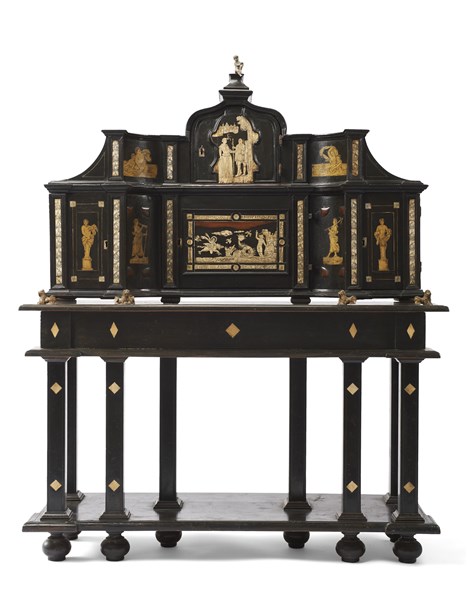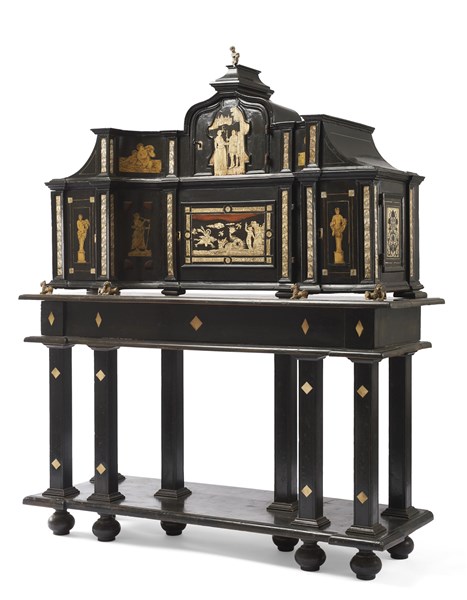 Stipo in legno ebanizzato di forma sagomata poggiante su piedi leonini in bronzo dorato. Anta centrale sormontata da timpano decorato da scena allegorica iscritta "D'un fortuna et doi peregrini fab. 64 (?)", e circondata da figure. Intarsiato con placche in avorio e altri materiali. Fine secolo XIX. Su base di epoca posteriore sorretta da otto colonne squadrate, piedi a cipolla (stipo cm 118x79x40,5; base cm 128x77x44,5) (restauri, sostituzioni e adattamenti)