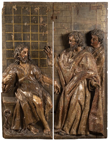 Spanish sculptor, Seville (?) in the circle of Juan Martínez Montañés (Alcalá la Real 1568 - Seville 1649), late 16th-early 17th century "St. John the Baptist in prison visited by two disciples" high relief consisting of two carved, painted and gilded wooden panels, from a retable (cm 200x200 ca.) (defects)