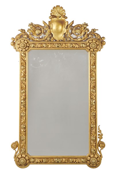 Specchiera in legno intagliato e dorato a volute fogliate e fiori. Cimasa sormontata da stemma tra girali. Al retro timbro "F. lli Salomoni. Fermo. Fabbrica di mobili" (cm 180x106) (difetti e restauri)