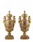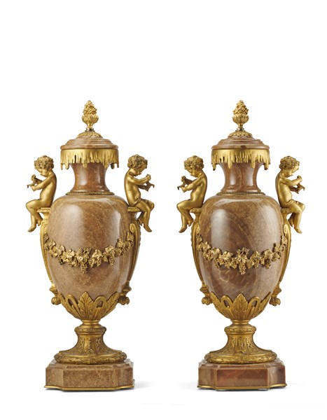Coppia di vasi biansati in breccia marrone, anse in foggi di putto bacchico con coppa e grappolo d'uva, fregi in bronzo dorato, basi ottagonali (h. cm 91) Montati a lampada in epoca posteriore (difetti)