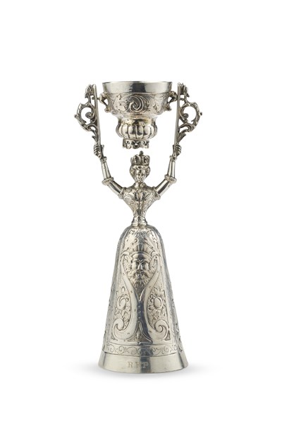 Coppa nuziale in argento raffigurante regina con abito cesellato a mascheroni,