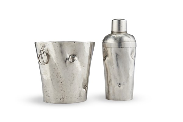 Uno shaker e un cestello portaghiaccio in argento decorato a finto tronco. Tito