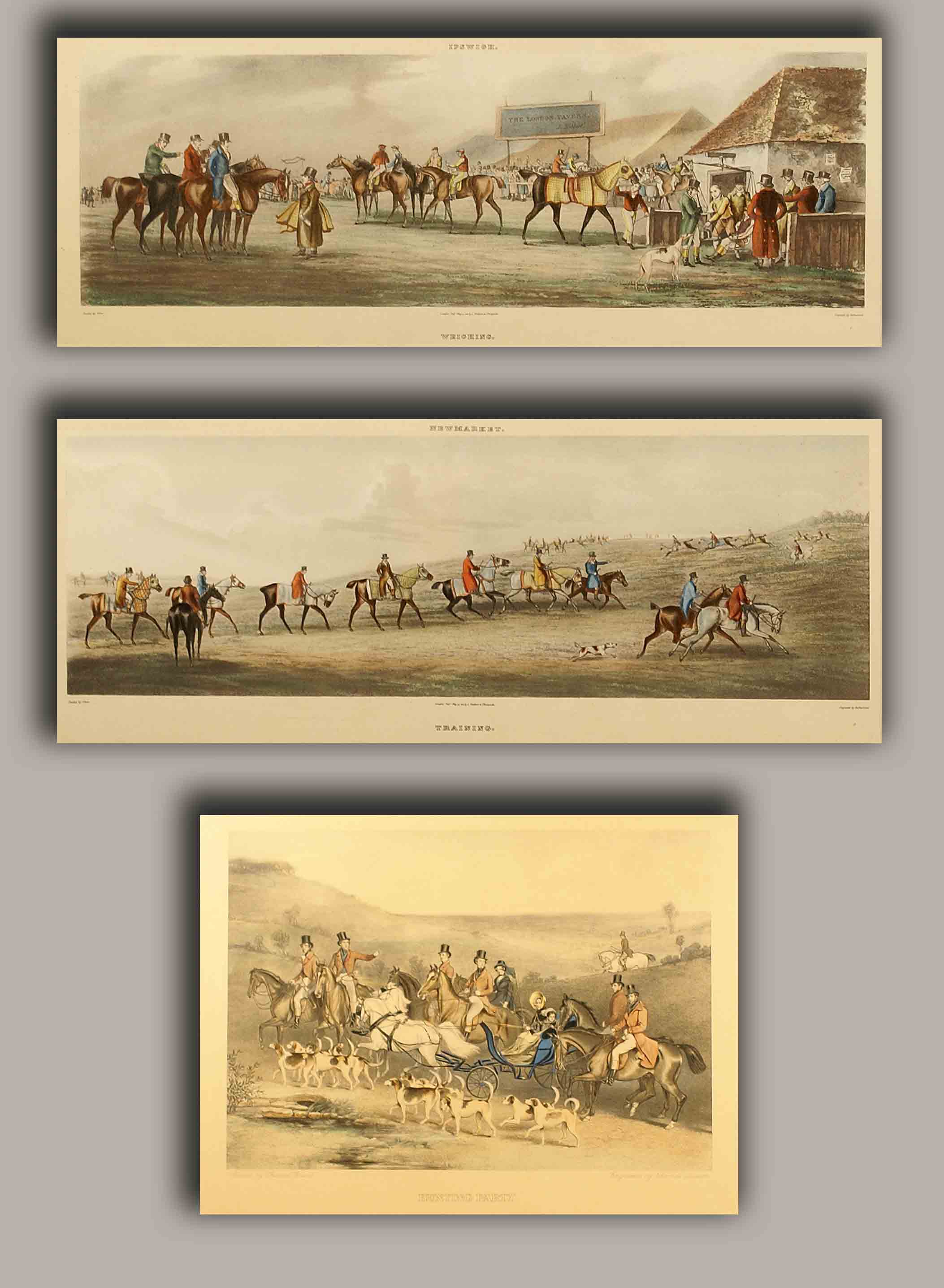 Lotto composto da tre stampe inglesi del XIX secolo, soggetti equestri,...