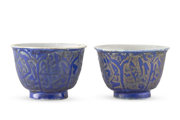 18th-century Islamic manufacture. Pair of ceramic cups with calligraphic decoration (h. cm 4,5) (minor defects)