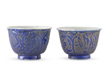 Manifattura islamica, secolo XVIII. Coppia di tazzine in ceramica con decoro calligrafico (h. cm 4,5) (lievi difetti)