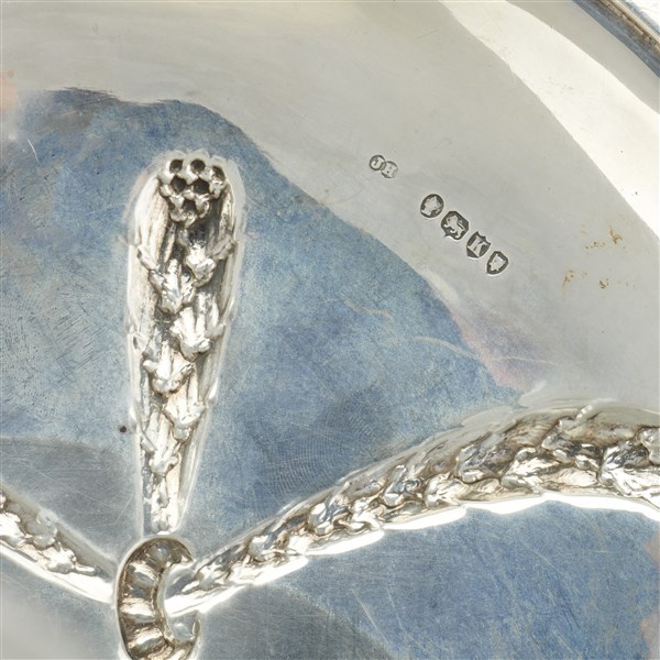 Portavivande biansato in argento inciso e sbalzato con corpo baccellato e profilo perlinato, coperchio decorato a ghirlande e nastri, cartigli con profilo di uomo barbuto e veliero, presa in osso. Londra, 1885 (cm 37x13) (g lordi 1040) (difetti)