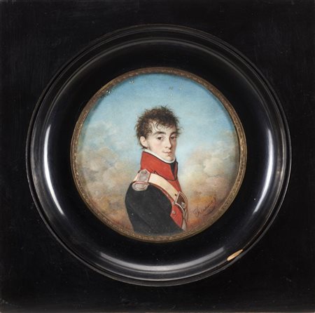Miniatura tonda su avorio, raffigurante ufficiale in uniforme, firmata a destra "L.M. Autissier P.T." In cornice in legno ebanizzato (cm tot. 18x18)