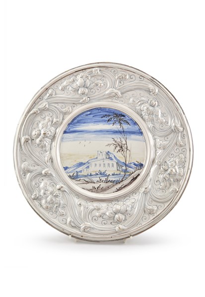 Manifattura Rampini, Pavia, secolo XVIII. Piatto in maiolica dipinta in policromia a paesetto con architetture nel cavetto e falda con rilievo a volute fiorite in monocromo (d. cm 35,5) (difetti e felature)