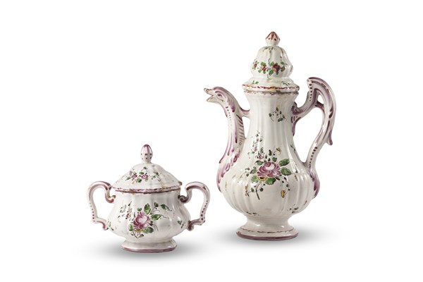 Manufacture of Pesaro or Monte Milone (Pollenza) 18th century. Lot comprising a polychrome painted majolica coffee pot and sugar bowl (h. max cm 27) (coffee pot with adapted lid; defects and restorations)