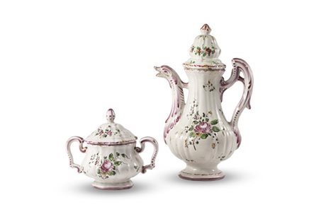 Manifattura di Pesaro o Monte Milone (Pollenza), secolo XVIII. Lotto composto da una caffettiera ed una zuccheriera con coperchio in maiolica dipinta in policromia decorati con motivo "alla rosa" e fiori sparsi (h. max cm 27) (caffettiera con coperchio adattato; difetti e probabili restauri)