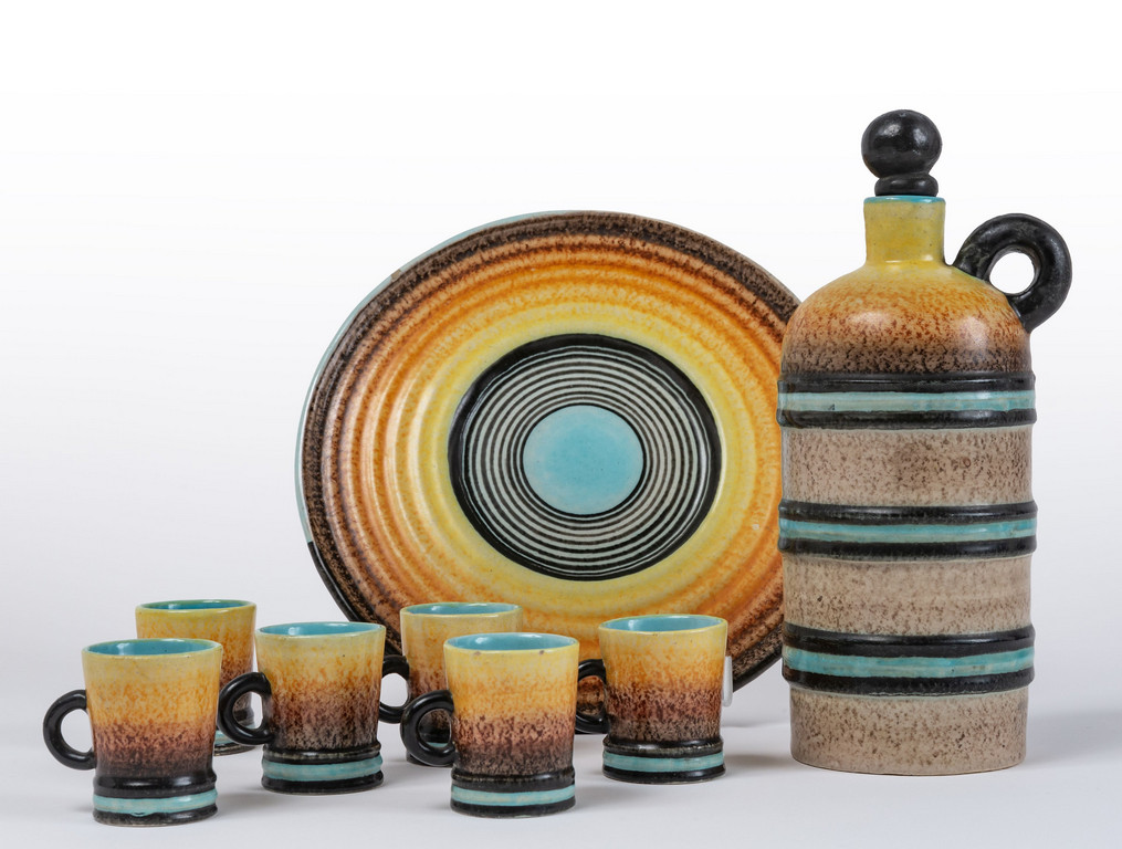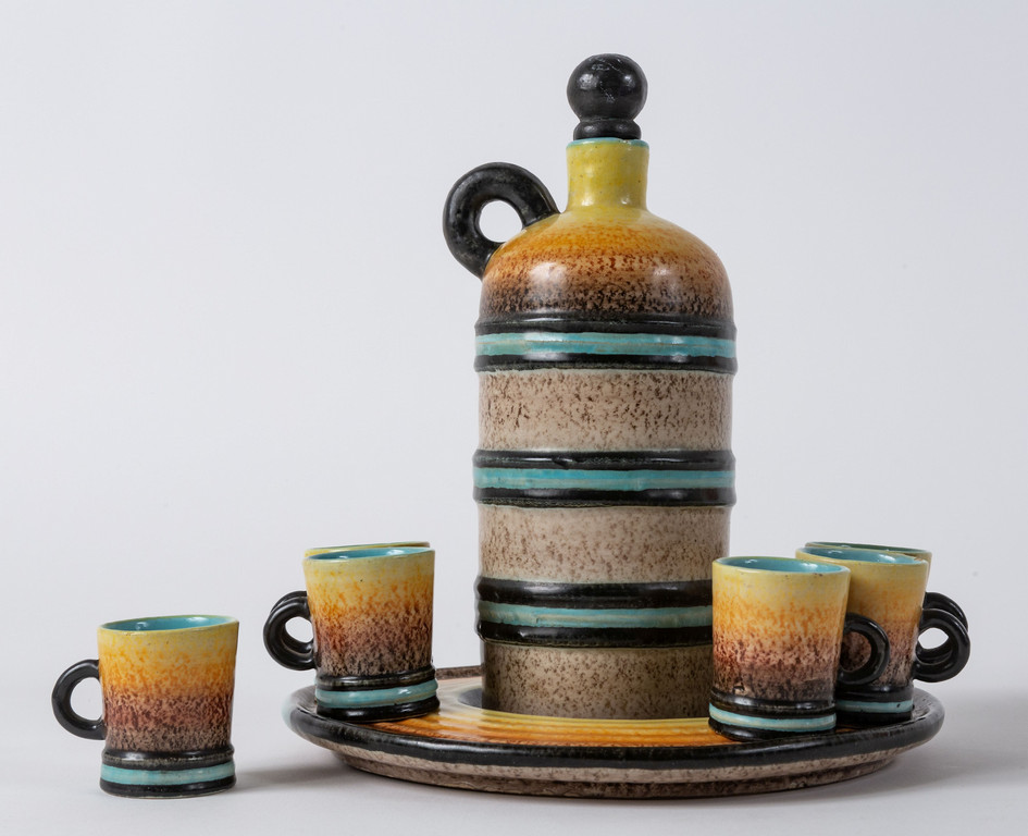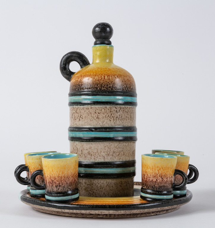 Servizio da liquore composto da un piatto sei bicchierini ed una brocca.