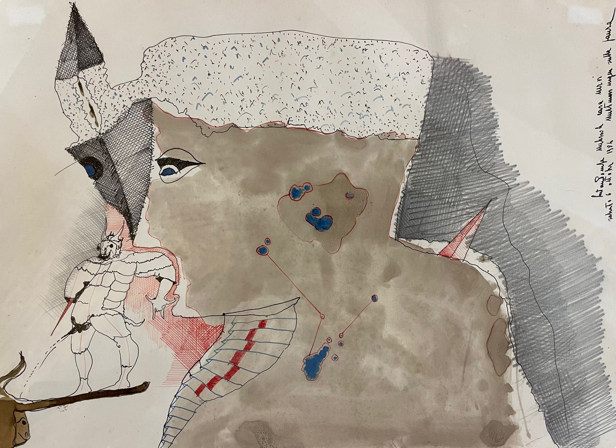 tecnica mista su carta 25 x 34,5 cm. Da un'importante collezione proveniente da casa Nervi. Iscrizioni autografe del Maestro: Gaetano Pompa Melezzole Casa Nervi sabato 6 ottobre 1984 Mutmassungen sulla paura. In cornice.