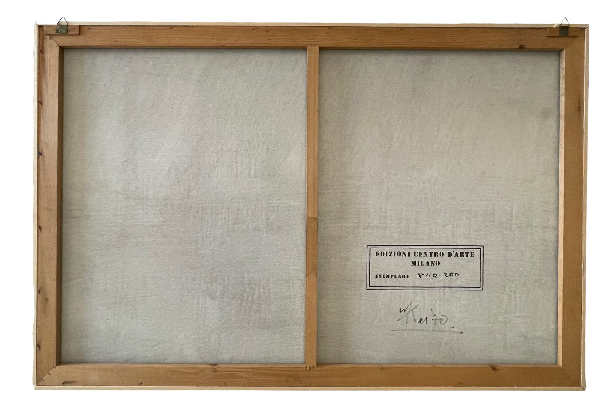 Serigrafia su tela 98 x 148cm. Esemplare numero 110 su 200. Firmata al retro. L'opera viene presentata con certificato d'autenticità della galleria La Spirale di Milano.