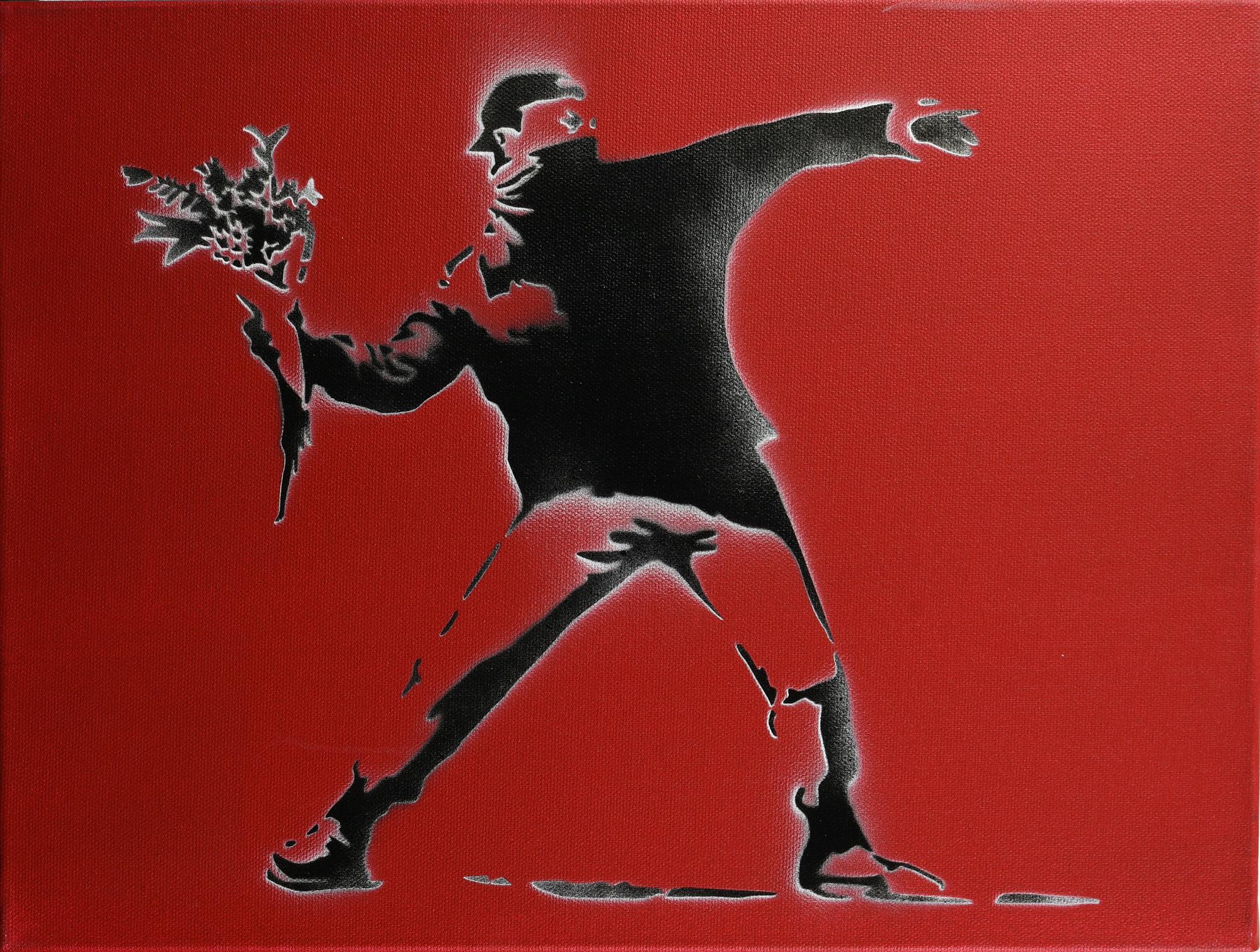Banksy FLOWER THROWER spray stencil su tela, cm 30x40x4; es. 16/20 firma a...