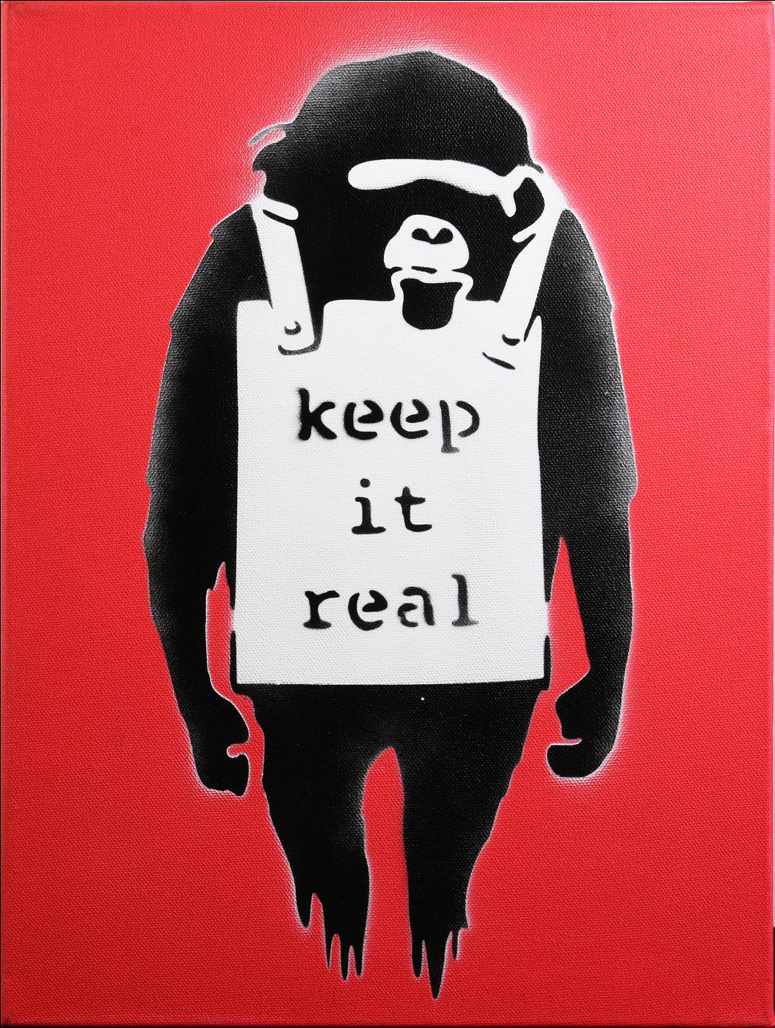 Banksy KEEP IT REAL spray stencil su tela, cm 40x30x4; es. 15/50 firma a...