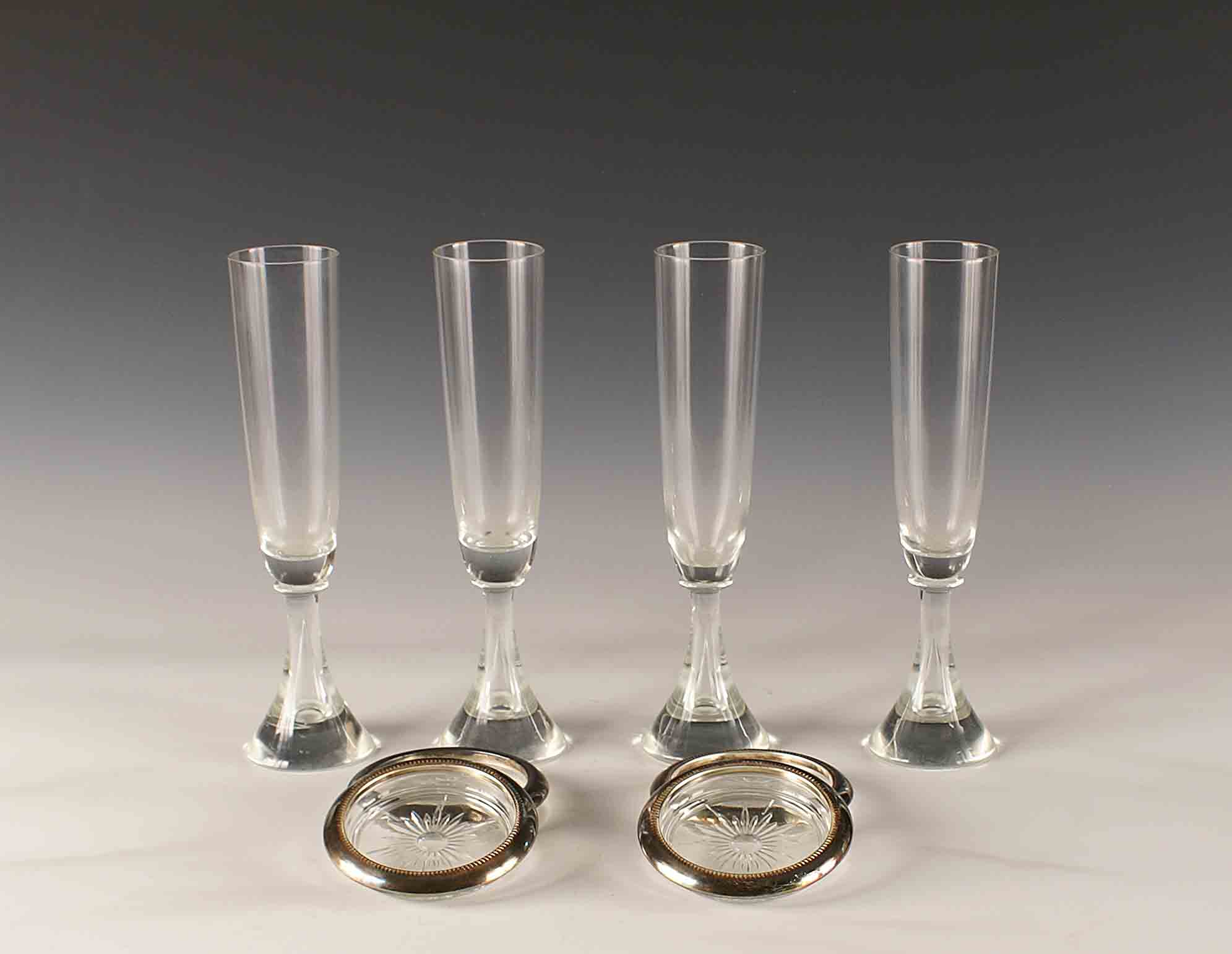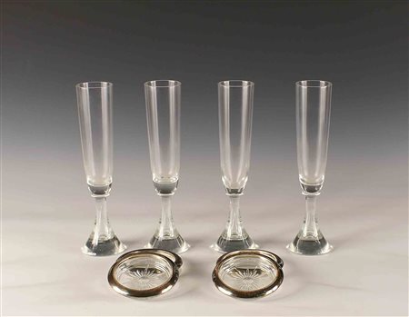 Lotto composto da sei flutes e undici sottobicchieri in vetro e silverplate,...