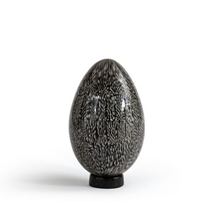 Un uovo a murrine bianconere poggiante su basetta in vetro nero