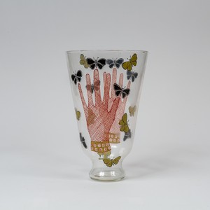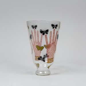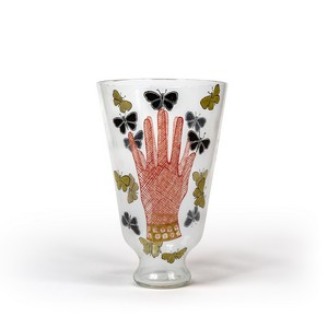 Un vaso in cristallo con decoro di mani e farfalle a smalti colorati.
