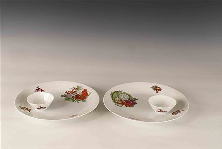 Servizio da cruditè composto da otto piatti piani e cinque coppette in porcellana bianca decorata a policromia, Germania, vecchia manifattura.