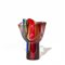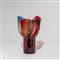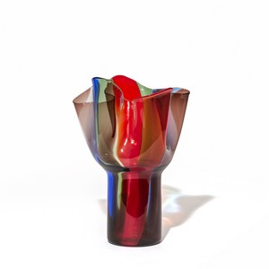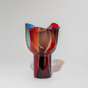 Un vaso 'kukinto' in vetro trasparente con fasce policrome verticali.