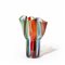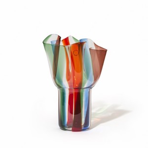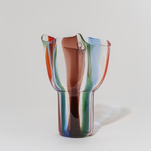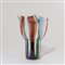 Un vaso 'kukinto' in vetro trasparente con fasce policrome verticali.