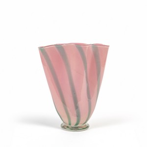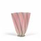 Un vaso a ventaglio rosa a fasce blu verticali e foglia oro.
