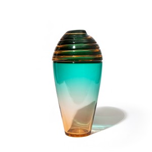 Un vaso 'vertigine' in vetro sfumato ametista e verde acqua con parte superiore a spirale di