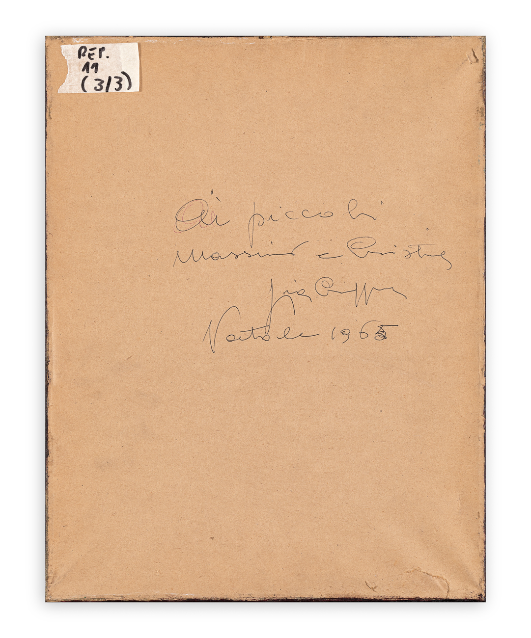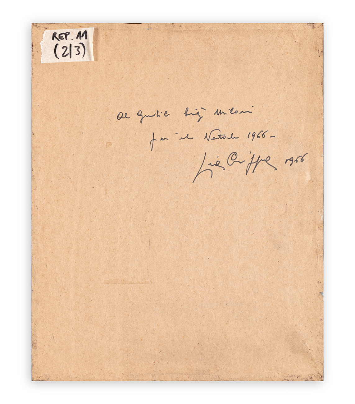 Firma e dedica ad personam datata 1965 al retro del cartoncino protettivo