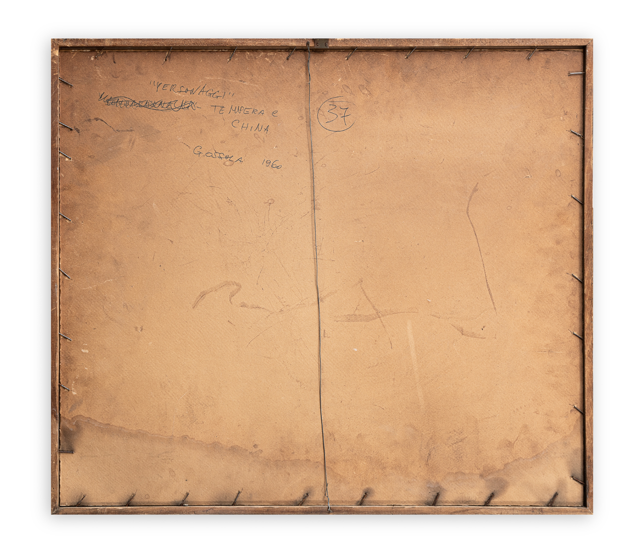 Iscrizione recante firma, titolo e datazione al retro del cartone protettivo