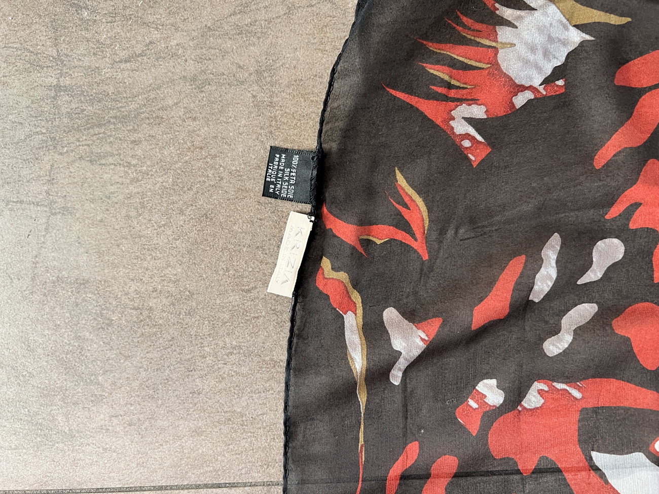 Precedente Lotto 89 Successivo Studio d'Arte Borromeo - Via Piave 3/B, 20030 Senago ASTA N.180 - PAINTINGS, PRINTS & MULTIPLES Sessione Unica martedì 24 ottobre 2023 ore 10:00 (UTC +01:00) KRIZIA - Foulard KRIZIAFoulardFoulard in setacm 86x86Logo Krizia