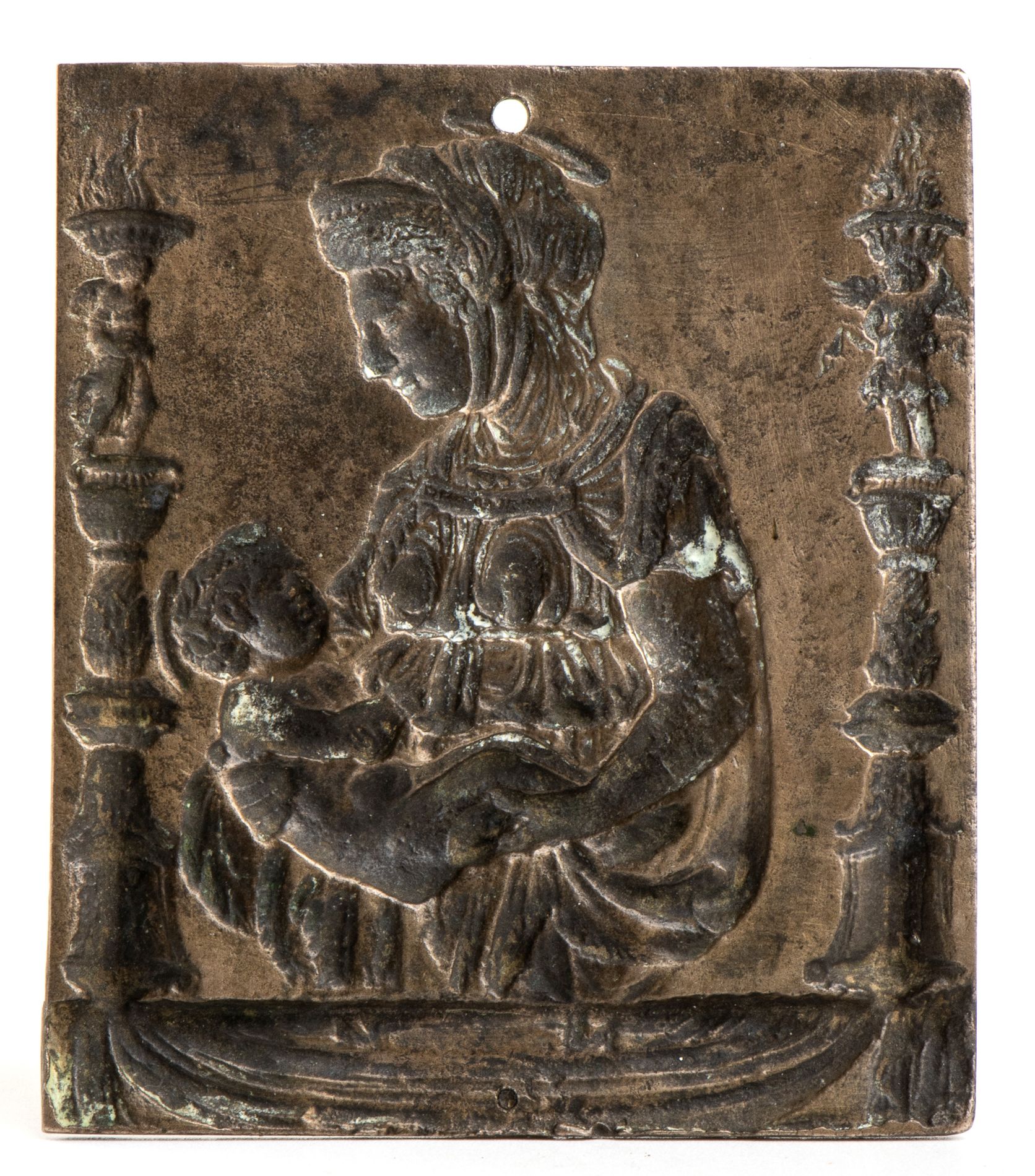 Madonna con velo e aureola verso destra, tiene tra le braccia il Bambino; ai lati due candelabri, appoggiati ad un davanzale con panneggio. Splendida fusione coeva.
