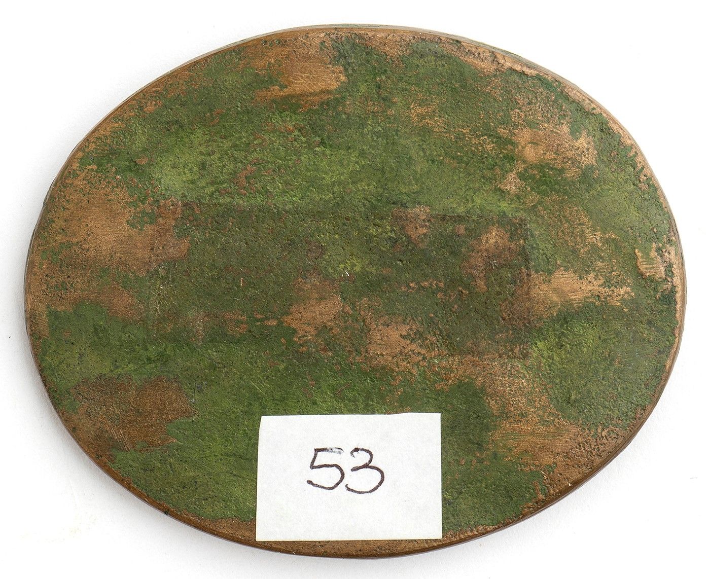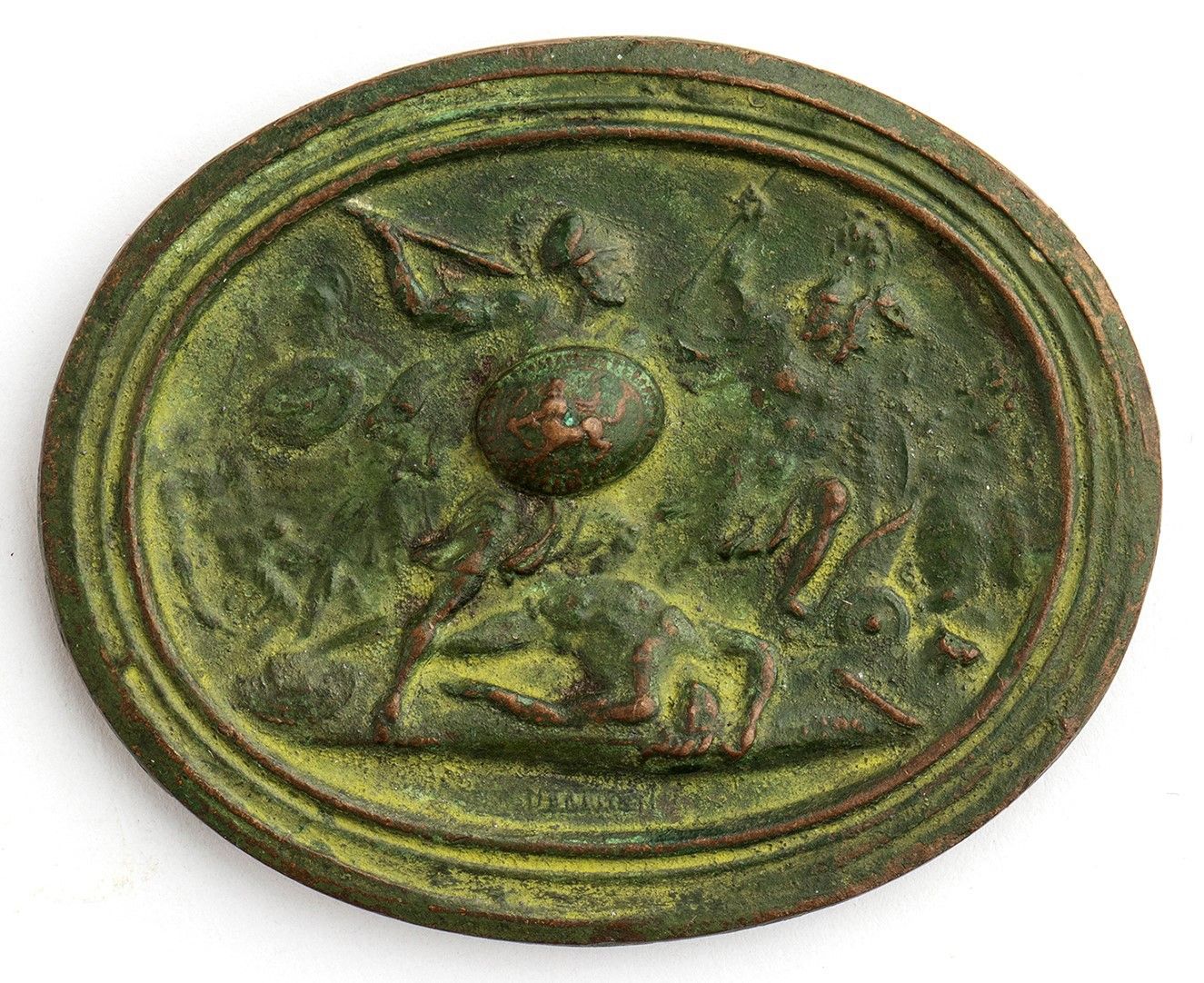 Al centro, un soldato con lancia e scudo in atto di colpire un fante con elmo piumato; dietro, una biga con cavaliere. A sinistra, un altro fante in combattimento; sotto, una figura maschile stesa. In esergo la scritta in cartiglio BRO....? Il tutto dentro un contorno lineare liscio e un secondo più sottile. Interessante lo scudo in rilievo del soldato con un Centauro con arco. Fusione molto tarda.