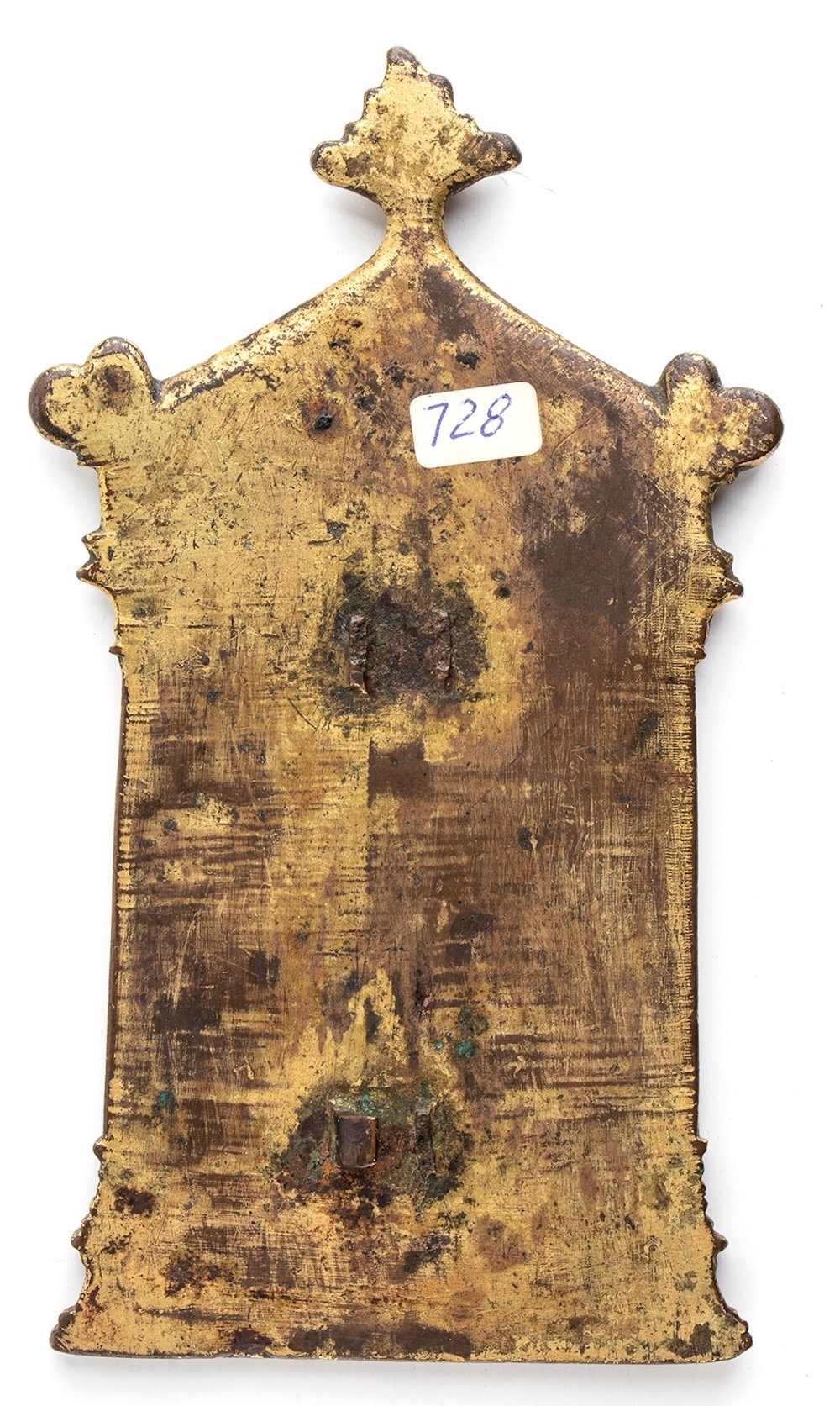 Pace in bronzo fuso dorato rettangolare centinato; mm 145,8 x 83,6; gr 254,6.