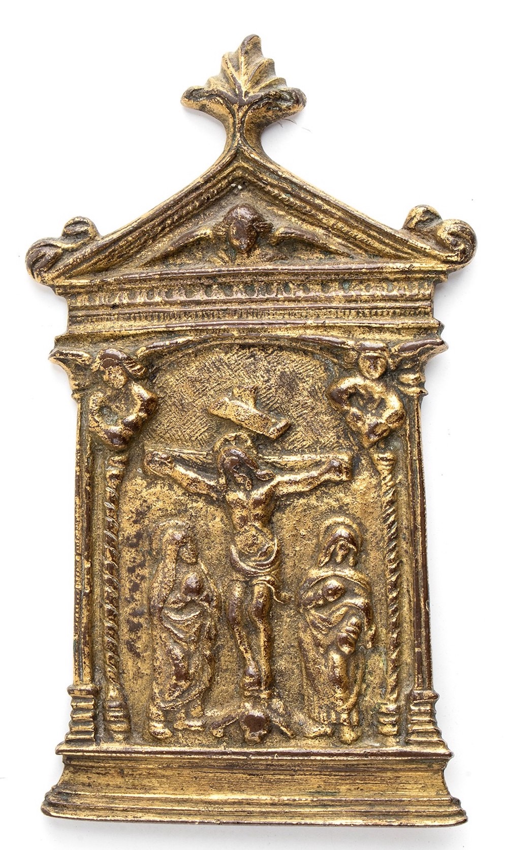 Gesù Cristo sulla croce sopra un dosso con alla base un teschio. A sinistra, Maria con aureola e a mani giunte; a destra, San Giovanni aureolato con la mano sul petto. Il tutto tra due colonne a torciglioni con angeli al posto dei capitelli; nel timpano, un angelo con le ali aperte. Fondo zigrinato nella parte alta e liscio in basso. Splendida fusione antica. Buona conservazione e rara variante.