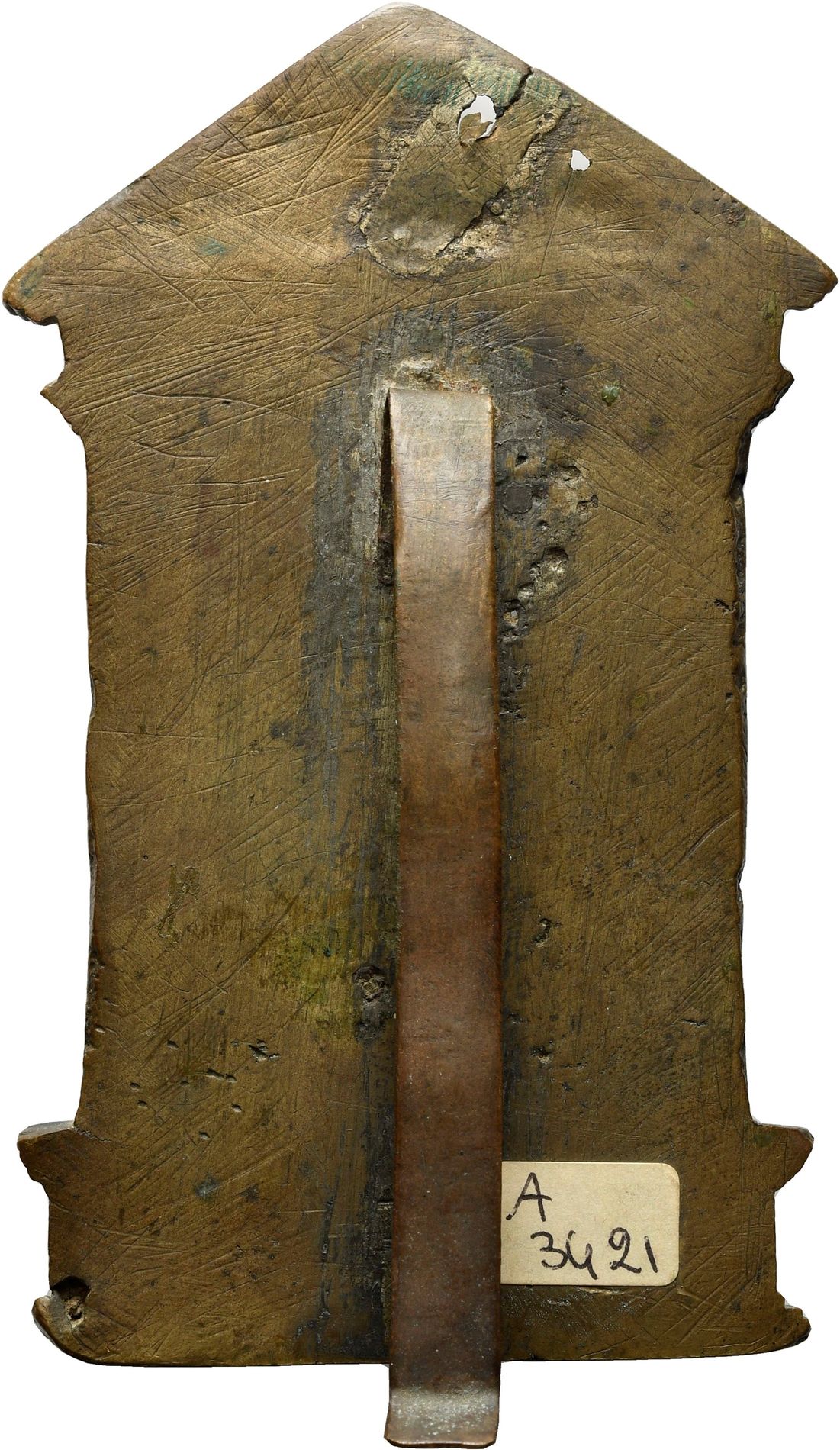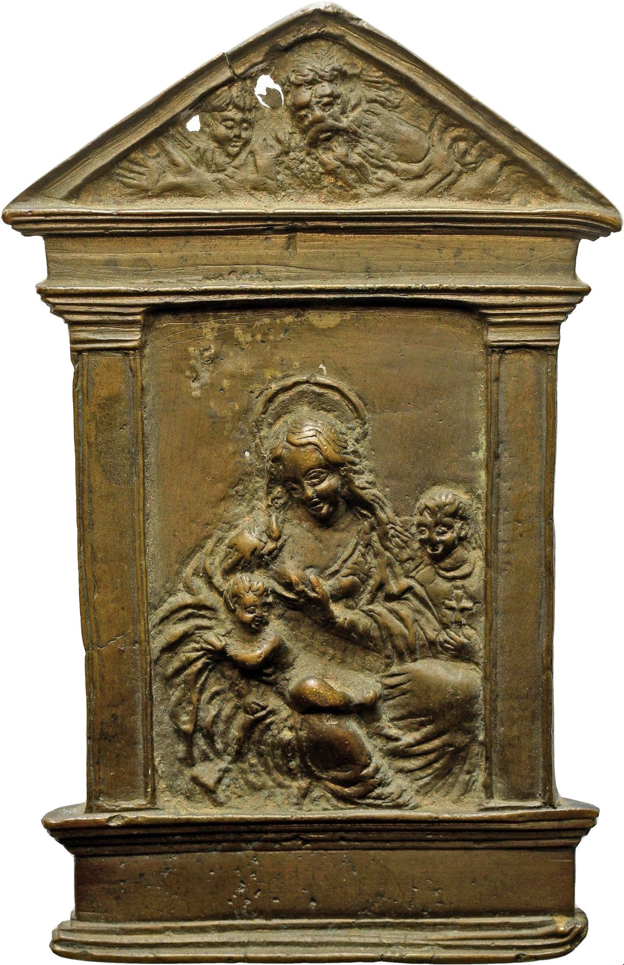 Pace in bronzo fuso con edicola a tempietto sec XVI; fusione tarda mm 112,2 x 72,8; gr 126,7.