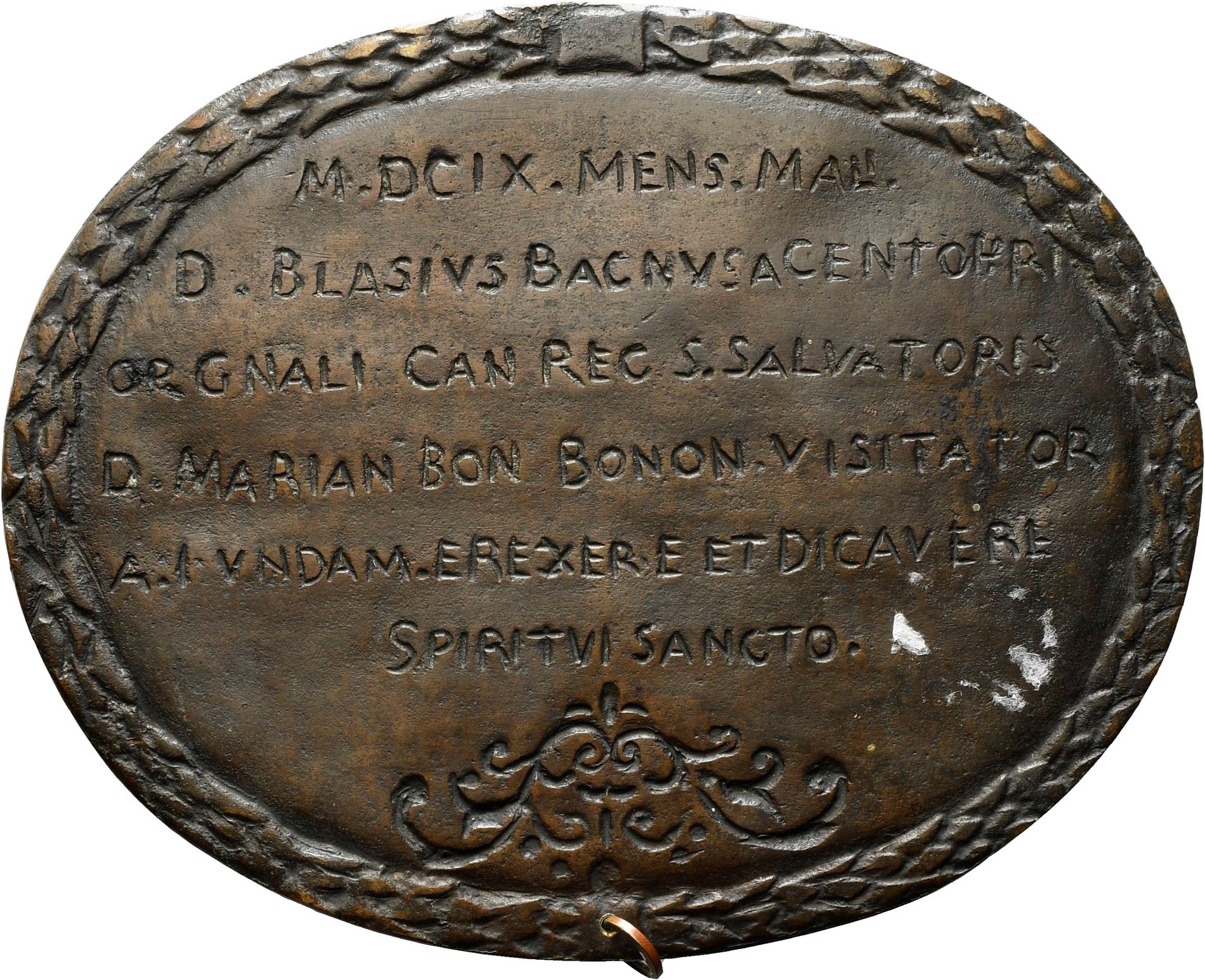 R\ lunga scritta in latino con data 1609 dentro corona d'alloro. Foro con anellino di sospensione. Fusione antica.