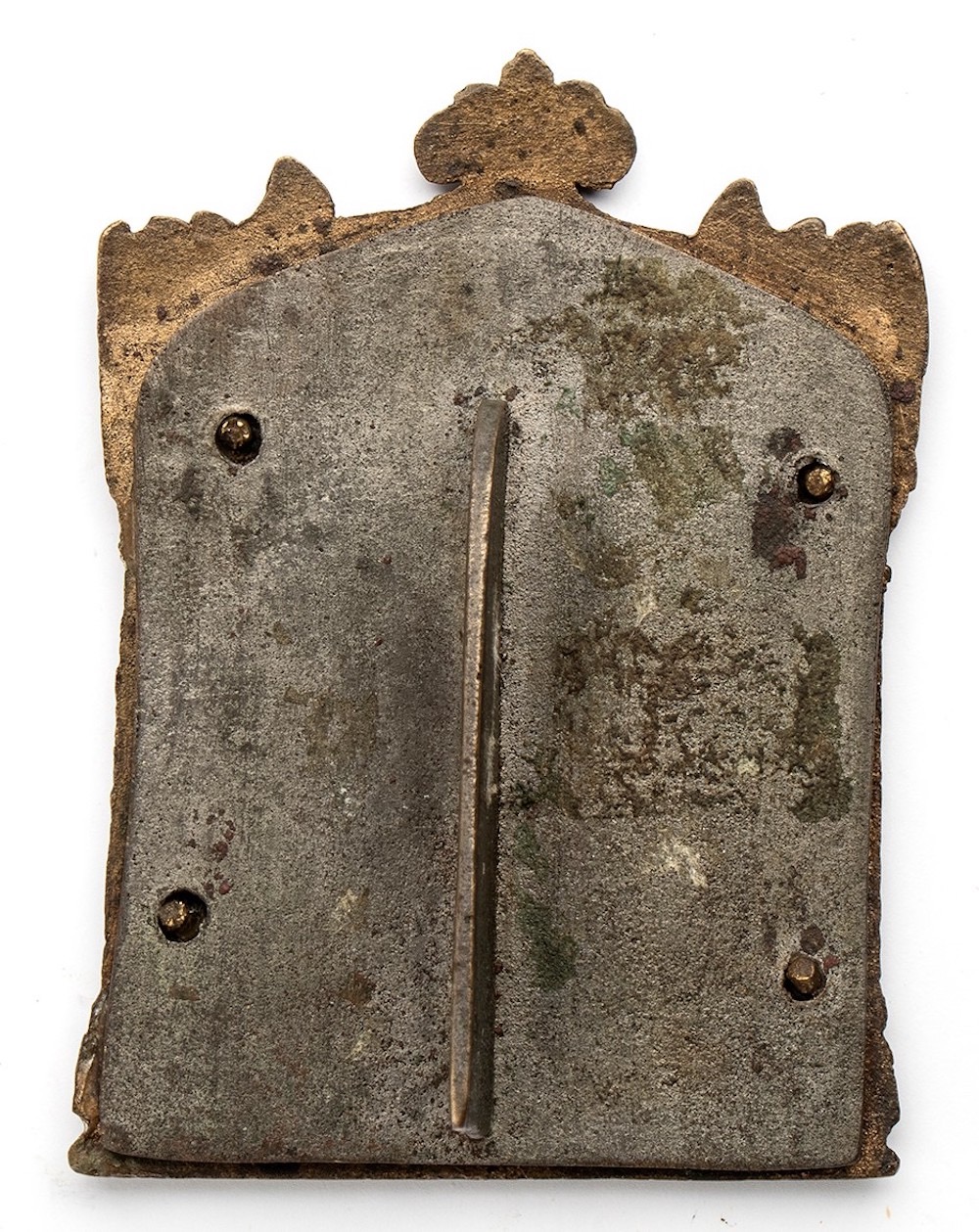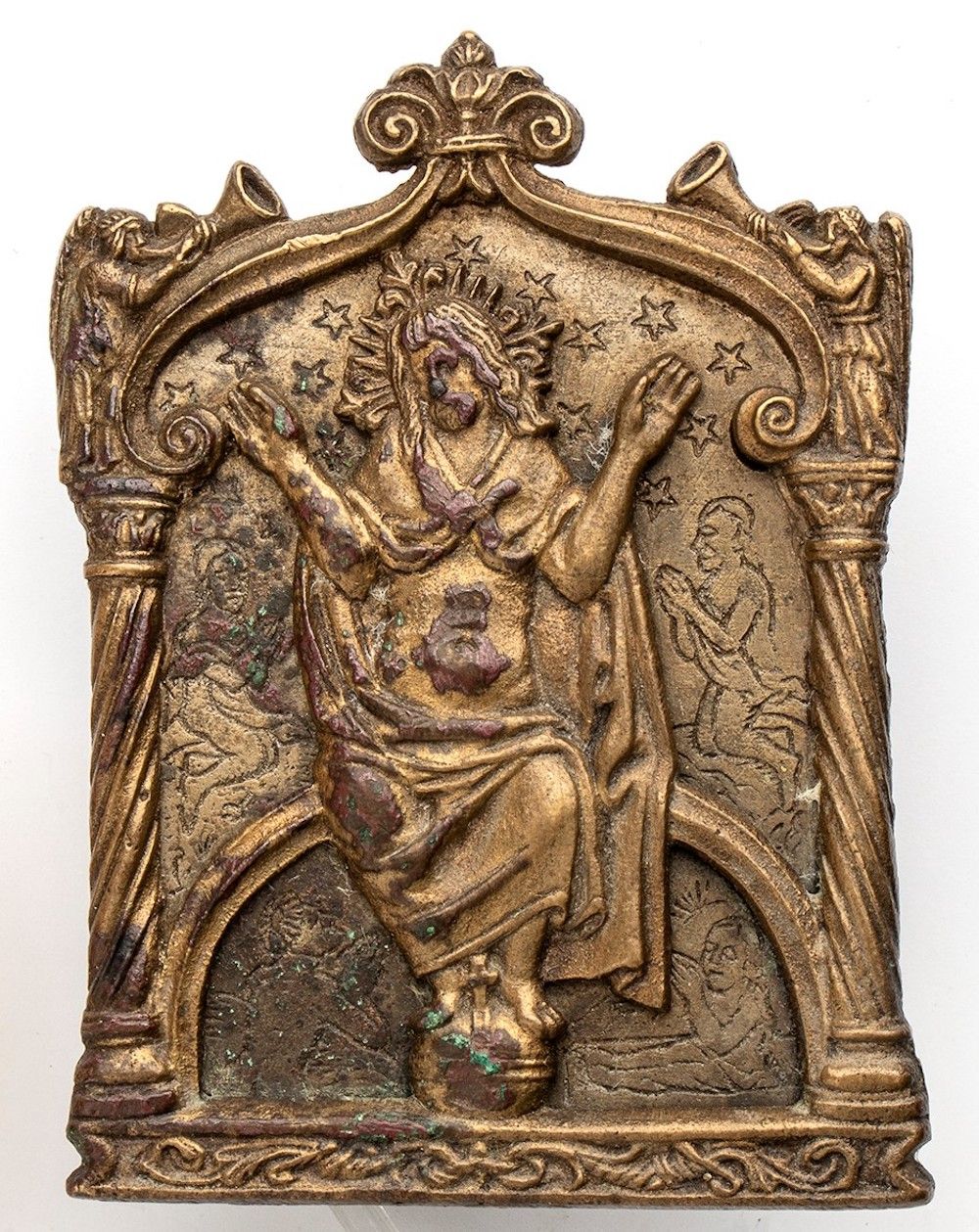 Il Padre Eterno seduto su di un arco con le braccia aperte, sotto i suoi piedi il globo crucigero. Fondo in lega successivo alla placchetta, con stelle e figure inginocchiate incise artigianalmente. Edicola formata da colonne a torciglioni, due angeli con trombe sopra i capitelli. Lamina in lega successiva alla fusione della placchette ad uso di Pace. Fusione antica