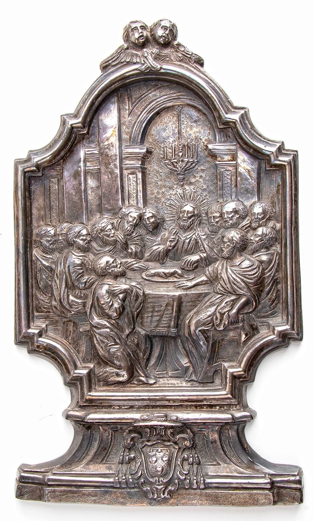 Scena dell’ ultima cena, con Gesù Cristo benedicente raggiato gli Apostoli e Maria Maddalena. Scena in un complesso architettonico; al centro dell’ arco un candeliere. Sopra due cherubini in basso sul basamento stemma con cappello cardinalizio di Antonio Pignatelli. Il tutto dentro una doppia cornice modanata. Sotto il basamento punzone dell’orefice non riconoscibile, e punzone di garanzia della Corporazione degli orefici NAP 71[6]? coronato. Splendido esemplare di raffinata lavorazione